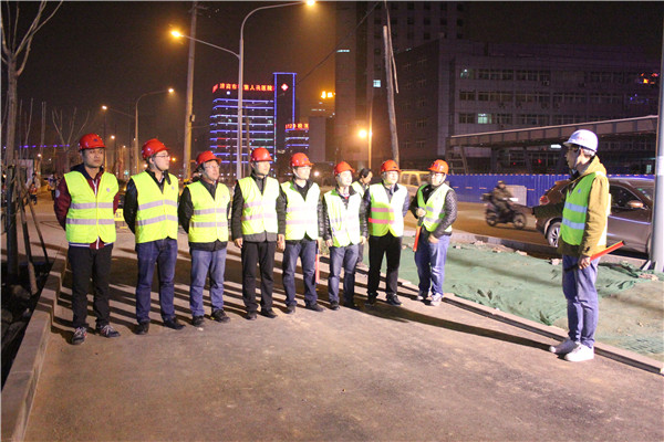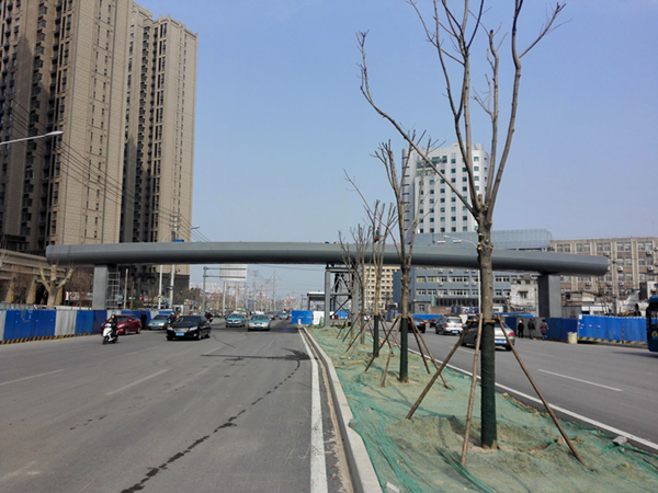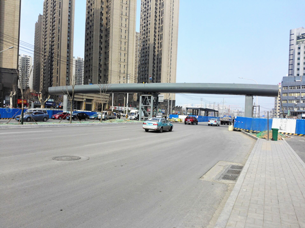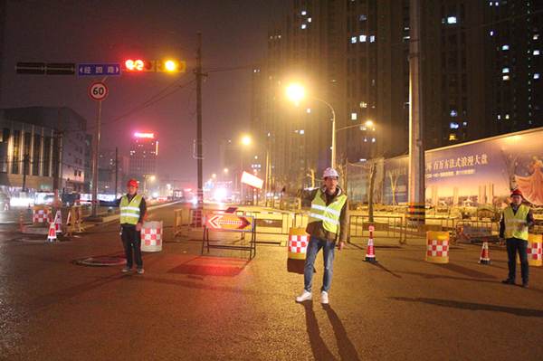 为保证吊装工作顺利进行,济南市市政工程有限公司项目部提前策划,与交警等相关部门充分沟通确定交通组织方案,建立吊装安全保障小组并明确人员分工;同时为保证后续施工道路交通安全,济南市市政工程有限公司项目部在南北两侧设立了临时限高杆。3月16日晚11时现场正式封闭西半幅快车道吊装西段主梁,在东半幅快车道中间进行隔离,南行及北行车辆分车道行驶,卢浮公馆小区东门与纬十二路交叉口在西侧箱梁吊装期间进行封闭,车辆及行人绕行小区西门或南门。西段主梁吊装完成后封闭东半幅快车道,吊装东段主梁。济南市市政工程有限公司于3月17日凌晨4时完成经五路人行天桥主箱梁吊装施工。