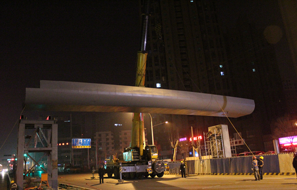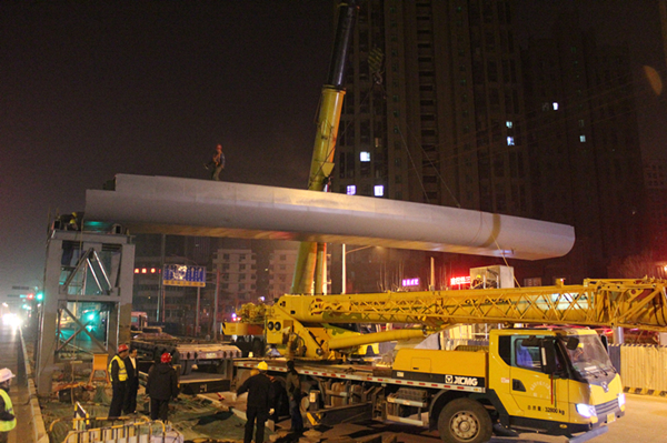 济南市市政工程有限公司承建的纬十二路人行天桥工程包含两座天桥,分别位于经二路南侧和经五路南侧,均横跨纬十二路。天桥两侧紧临普通公交站台,中间与BRT站台相接,桥梁上部结构采用钢箱梁,桥梁全长60米,宽4米,共3跨,下部结构采用钢板墩,共设置5处步梯及3部垂直升降电梯,梯道宽2.5米。3月16日晚至3月17日凌晨,济南市市政工程有限公司项目部进行经五路南侧人行天桥主箱梁吊装施工。