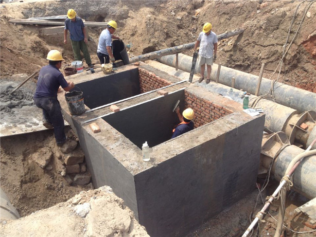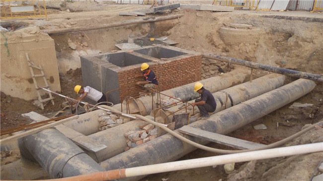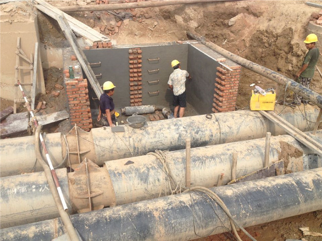 华山西路路口处热力放水阀检查井砌筑,固支钢筋绑扎,模板支设,下一步工序进行砼浇筑