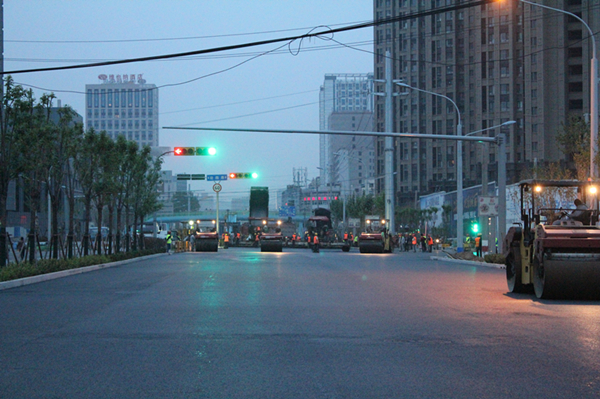 该工程自立项、规划、招投标、开工建设到顺利完工无一不受到社会各界的广泛关注。济南市市政工程有限公司纬十二路项目部分工明确、有序协调,经过三天两夜的连续不间断奋战,顺利圆满的完成了摊铺任务。