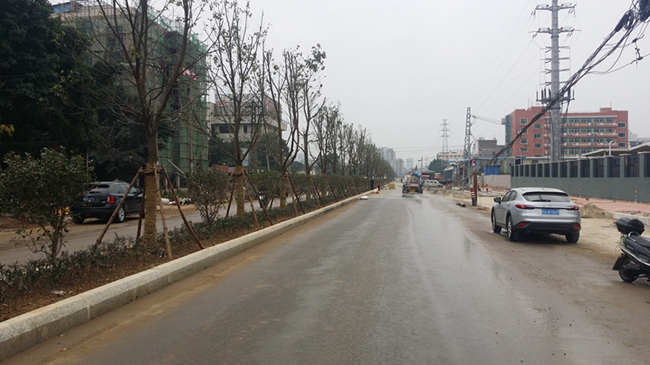 道路横断面为:3.75米(人行道)+1.5米(行道树)+2.5(非机动车道)+0.5米(侧分隔栏杆)+10.75米(机动车道)+2米(中央绿化带)+10.75米(机动车道)+0.5米(侧分隔栏杆)+2.5(非机动车道)+1.5米(行道树)+3.75(人行道)=40米